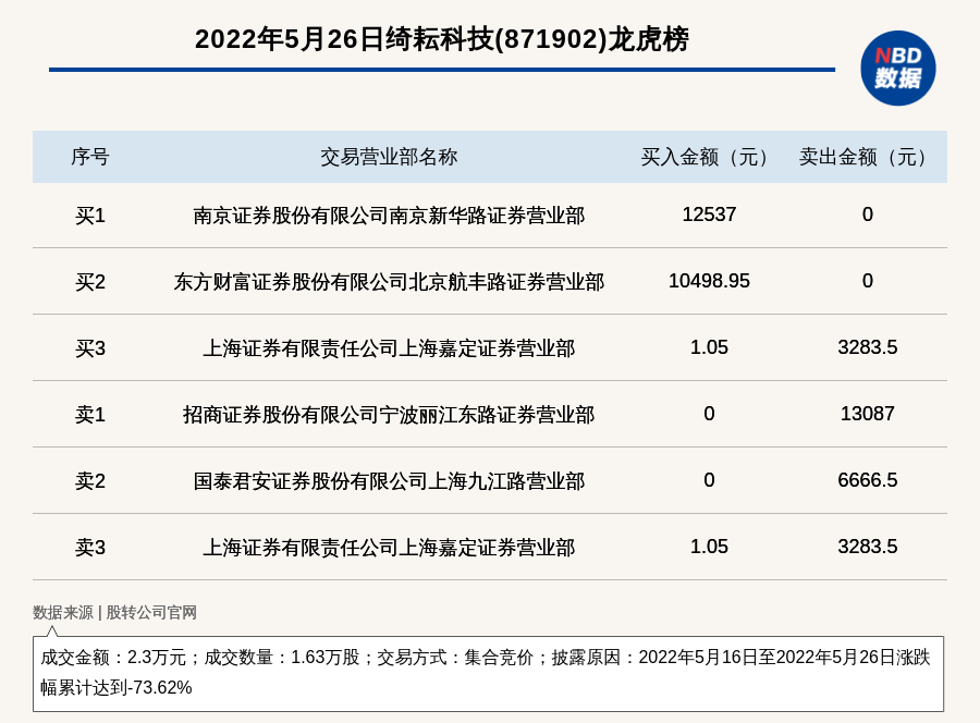 每经讯,2022年5月26日,新三板基础层公司绮耘科技(871902)登上龙虎榜,交易方式是集合竞价,披露原因是2022年5月16日至2022年5月26日涨跌幅累计达到-73.62%,成交数量1.63万股,成交金额2.3万元。买一席位为南京证券股份有限公司南京新华路证券营业部,买入1.25万元;卖一席位为招商证券股份有限公司宁波丽江东路证券营业部,卖出1.31万元。