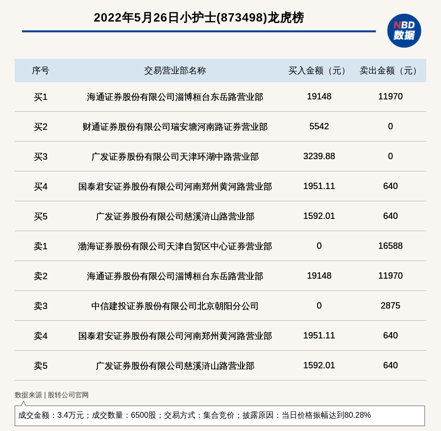 每经讯,2022年5月26日,新三板创新层公司小护士(873498)登上龙虎榜,交易方式是集合竞价,披露原因是当日价格振幅达到80.28%,成交数量6500股,成交金额3.4万元。买一席位为海通证券股份有限公司淄博桓台东岳路营业部,买入1.91万元;卖一席位为渤海证券股份有限公司天津自贸区中心证券营业部,卖出1.66万元。