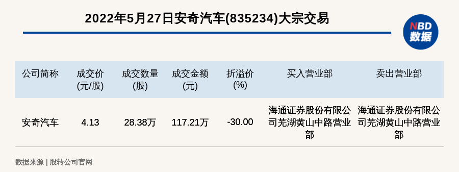 每经讯,2022年5月27日,新三板创新层公司安奇汽车(835234)发生一笔大宗交易,成交价4.13元/股,成交数量28.38万股,成交金额117.21万元,折价30%。买入营业部是海通证券股份有限公司芜湖黄山中路营业部,卖出营业部是海通证券股份有限公司芜湖黄山中路营业部。