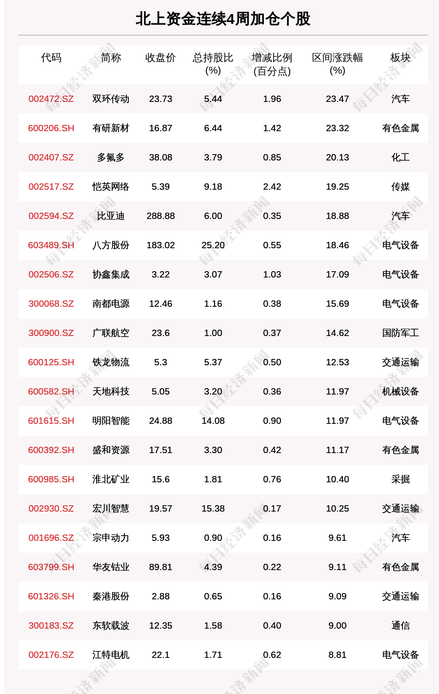 北上资金连续4周买入75个股,其中化工行业的个股最多,有9只。从市场表现来看,北上资金连续4周的加仓个股中,本周63只个股股价上涨,其中双环传动(002472.SZ,收盘价:23.73元)涨幅最大,上涨23.47%,其他涨幅较大的个股包括有研新材(600206.SH,收盘价:16.87元)、多氟多(002407.SZ,收盘价:38.08元)、恺英网络(002517.SZ,收盘价:5.39元)。