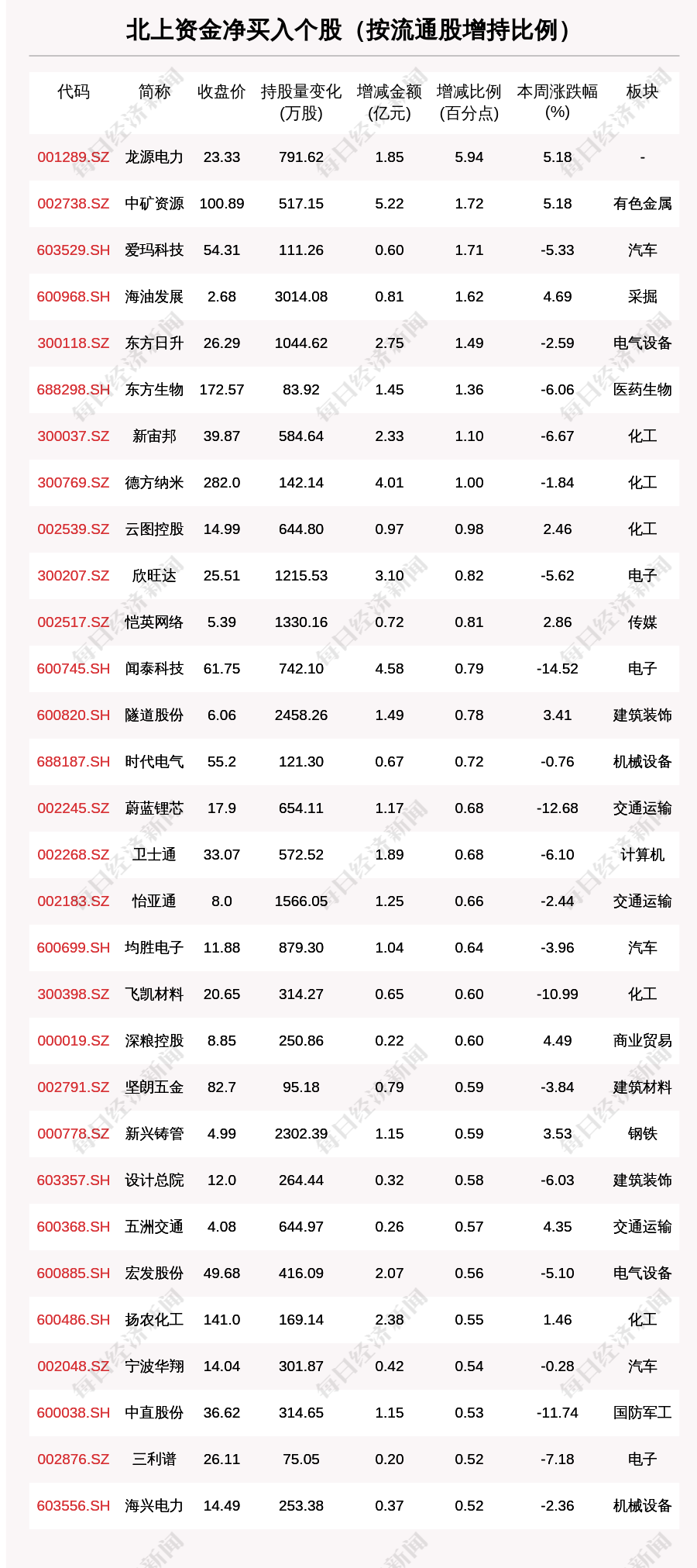 本周北上资金净买入个股共有527只,北上资金加仓比例超1%的有483只。其中,龙源电力(001289.SZ,收盘价:23.33元)加仓比例最为明显,最新持股比例12.37%,环比增加5.94个百分点。其他北上资金加仓比例较多的个股还包括中矿资源(002738.SZ,收盘价:100.89元)、爱玛科技(603529.SH,收盘价:54.31元)、海油发展(600968.SH,收盘价:2.68元)。
