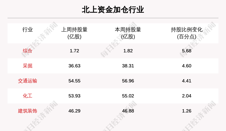 本周北上资金加仓的行业共有9个。其中,综合行业加仓最明显,北上资金持股数环比增加5.68%。其他北上资金加仓较多的行业还包括采掘、交通运输、化工。