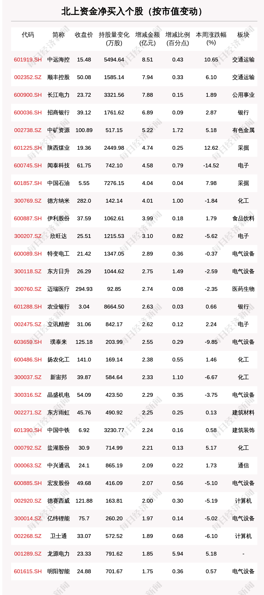 按照北向资金增持市值排序,中远海控(601919.SH,收盘价:15.48元)增持市值最大,增持市值8.506亿元,环比增加17.87%。其他北上资金增持市值较多的个股还包括顺丰控股(002352.SZ,收盘价:50.08元)、长江电力(600900.SH,收盘价:23.72元)、招商银行(600036.SH,收盘价:39.12元)。