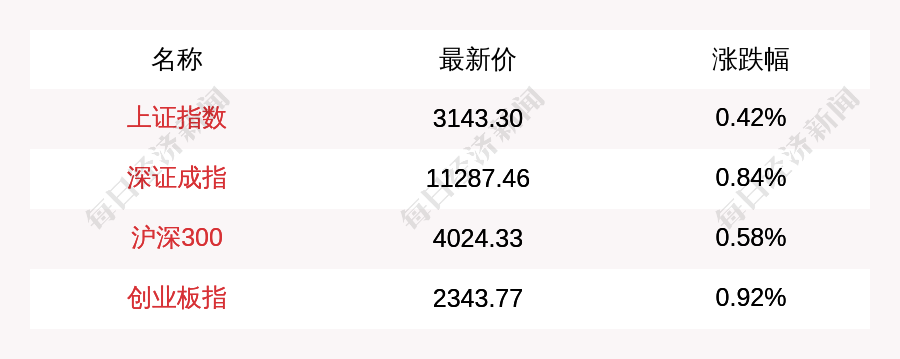 截至北京时间13:30,上证指数报3143.30点,涨0.42%,深证成指报11287.46点,涨0.84%,沪深300报4024.33点,涨0.58%,创业板指报2343.77点,涨0.92%