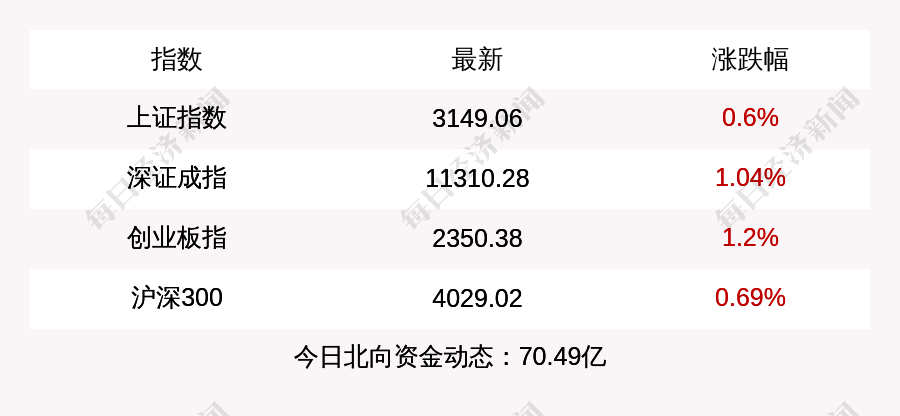 每经AI快讯:北京时间5月30日15:00,上证指数收盘上涨18.82点,涨幅为0.6%,报收3149.06点,成交额3766.68亿元;深证成指收盘上涨116.69点,涨幅为1.04%,报收11310.28点,成交额4343.75亿元;创业板指收盘上涨27.9点,涨幅为1.2%,报收2350.38点,成交额1291.27亿元;沪深300收盘上涨27.72点,涨幅为0.69%,报收4029.02点,成交额2111.45亿元。北上资金当日净流入70.49亿元。