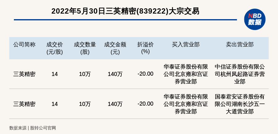 每经讯,2022年5月30日,新三板创新层公司三英精密(839222)发生2笔大宗交易,总成交金额为280万元,其中一笔成交价14元/股,成交数量10万股,成交金额140万元,折价20%。买入营业部是华泰证券股份有限公司北京雍和宫证券营业部,卖出营业部是中信证券股份有限公司杭州凤起路证券营业部。