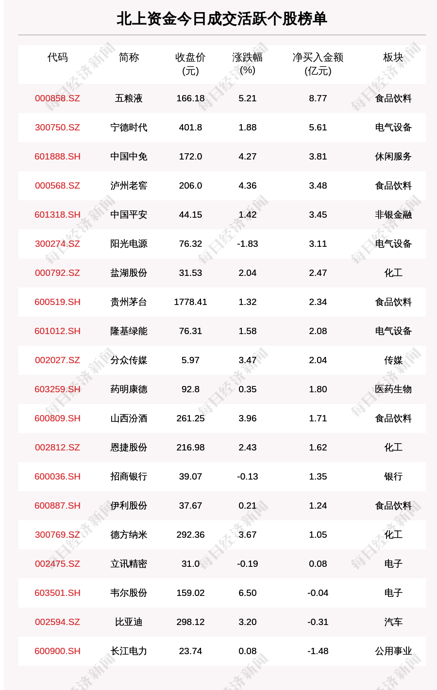 5月30日,北上资金成交活跃个股榜单中,净买入个股共17只,金额最多的是五粮液(000858.SZ,收盘价:166.18元),净买入8.767亿元;净卖出个股共3只,金额最多的是长江电力(600900.SH,收盘价:23.74元),净卖出1.483亿元。