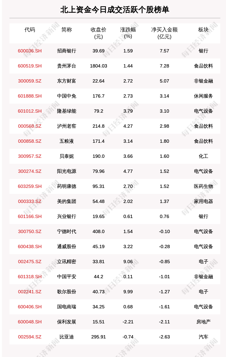 5月31日,北上资金成交活跃个股榜单中,净买入个股共12只,金额最多的是招商银行(600036.SH,收盘价:39.69元),净买入7.566亿元;净卖出个股共8只,金额最多的是比亚迪(002594.SZ,收盘价:295.91元),净卖出2.627亿元。