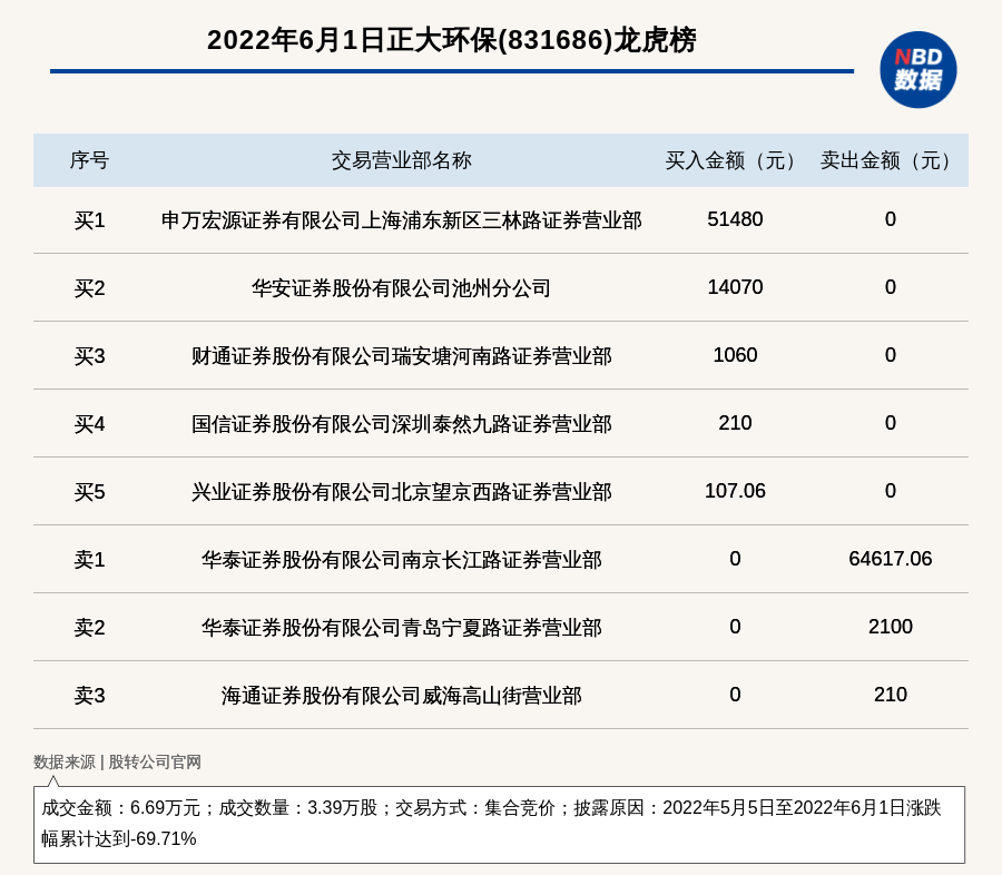 每经讯,2022年6月1日,新三板创新层公司正大环保(831686)登上龙虎榜,交易方式是集合竞价,披露原因是2022年5月5日至2022年6月1日涨跌幅累计达到-69.71%,成交数量3.39万股,成交金额6.69万元。买一席位为申万宏源证券有限公司上海浦东新区三林路证券营业部,买入5.15万元;卖一席位为华泰证券股份有限公司南京长江路证券营业部,卖出6.46万元。