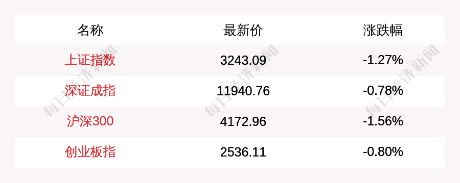 截至北京时间14:30,上证指数报3243.09点,跌1.27%,深证成指报11940.76点,跌0.78%,沪深300报4172.96点,跌1.56%,创业板指报2536.11点,跌0.80%