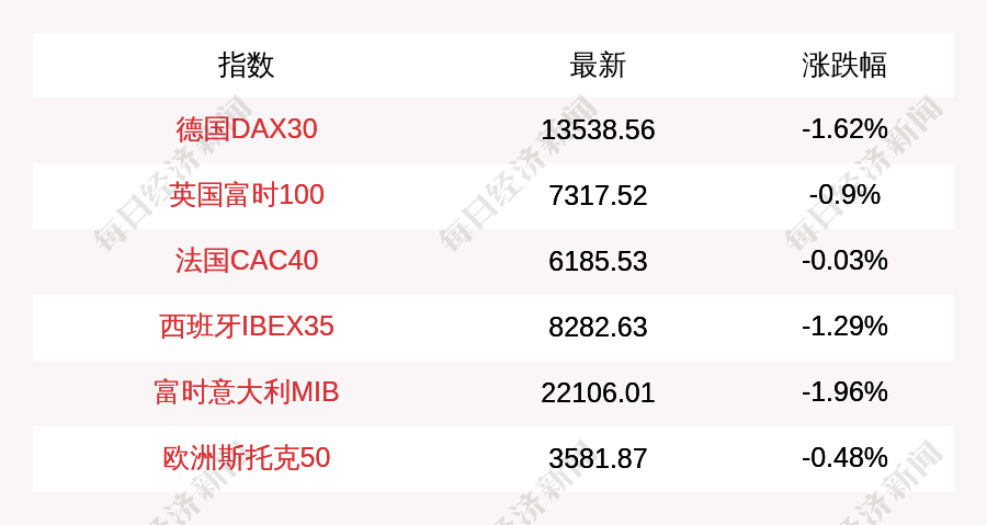 每经AI快讯:北京时间6月13日15:00,德国DAX30指数开盘下跌223.27点,跌幅为1.62%,报13538.56点;英国富时100指数开盘下跌66.05点,跌幅为0.9%,报7251.47点;法国CAC40指数开盘下跌1.7点,跌幅为0.03%,报6185.53点;西班牙IBEX35指数开盘下跌107.97点,跌幅为1.29%,报8282.63点;富时意大利MIB指数开盘下跌441.47点,跌幅为1.96%,报22106.01点;欧洲斯托克50指数开盘下跌17.33点,跌幅为0.48%,报3581.87点。