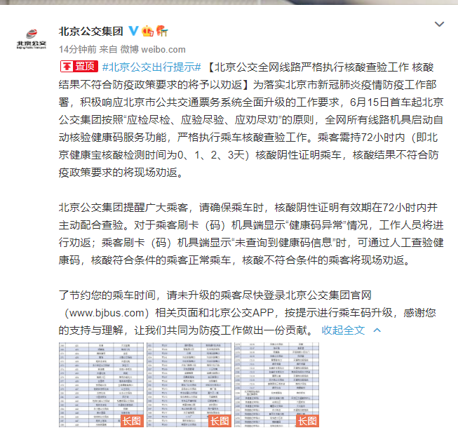 据“北京公交集团”微博号6月14日消息,为落实北京市新冠肺炎疫情防控工作部署,积极响应北京市公共交通票务系统全面升级的工作要求,6月15日首车起北京公交集团按照“应检尽检、应验尽验、应劝尽劝”的原则,全网所有线路机具启动自动核验健康码服务功能,严格执行乘车核酸查验工作。乘客须持72小时内(即北京健康宝核酸检测时间为0、1、2、3天)核酸阴性证明乘车,核酸结果不符合防疫政策要求的将现场劝返。