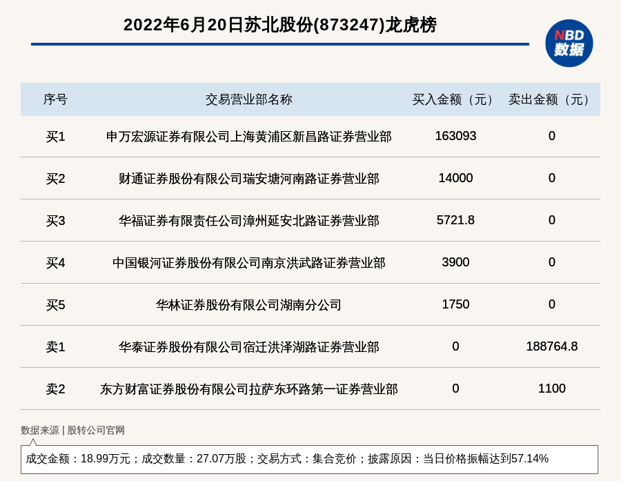 每经讯,2022年6月20日,新三板基础层公司苏北股份(873247)登上龙虎榜,交易方式是集合竞价,披露原因是当日价格振幅达到57.14%,成交数量27.07万股,成交金额18.99万元。买一席位为申万宏源证券有限公司上海黄浦区新昌路证券营业部,买入16.31万元;卖一席位为华泰证券股份有限公司宿迁洪泽湖路证券营业部,卖出18.88万元。