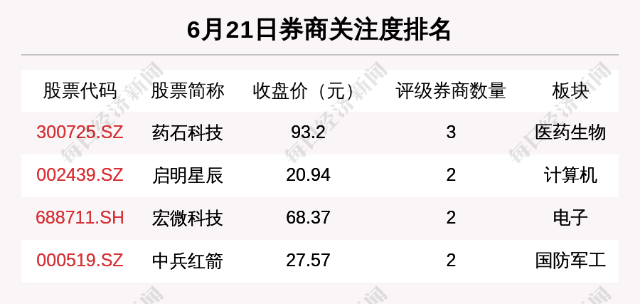 从券商对个股的关注程度来看,有4只个股获得多家券商关注,券商关注数量排名居前的个股是药石科技(300725.SZ)、启明星辰(002439.SZ)、宏微科技(688711.SH)。