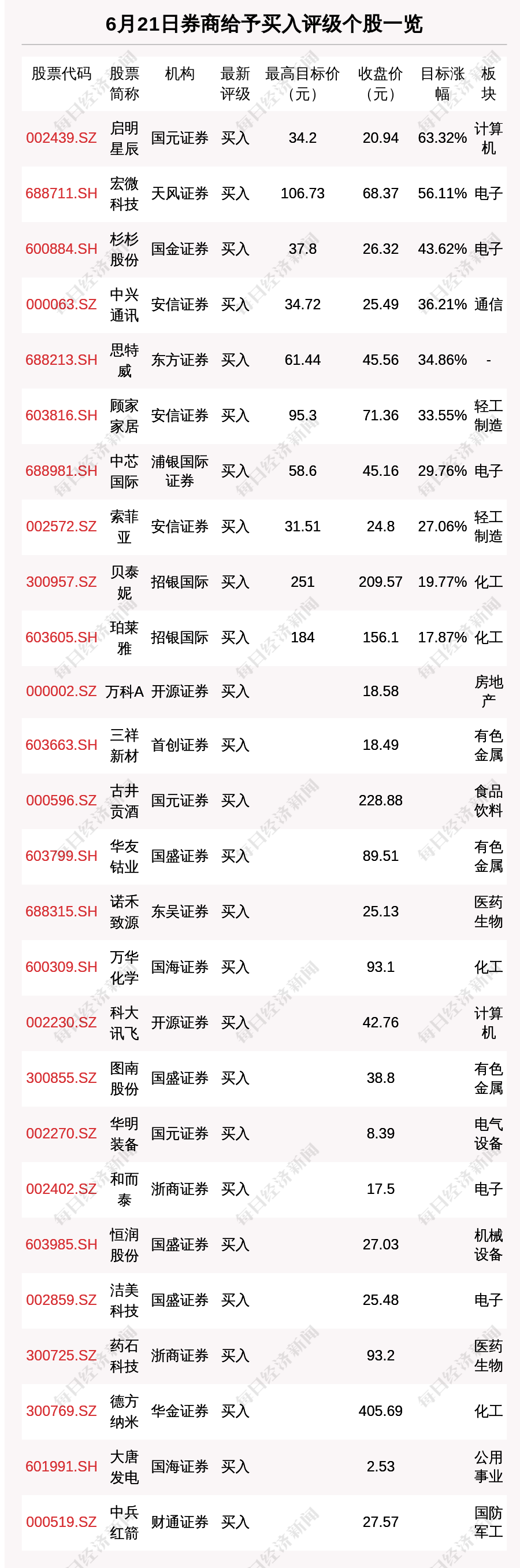 每经AI快讯,6月21日,券商给予评级的个股数共有37只,获得买入评级的个股数共有26只。在公布了目标价格的10只个股中,按照最新收盘价计算,预期涨幅排名居前的个股是启明星辰(002439.SZ)、宏微科技(688711.SH)、杉杉股份(600884.SH),预期涨幅分别是63.32%、56.11%、43.62%。