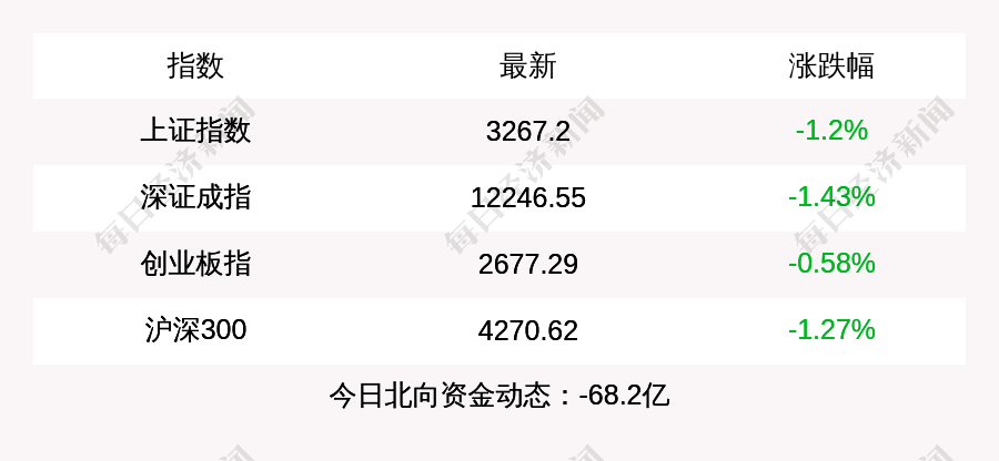 每经AI快讯:北京时间6月22日15:00,上证指数收盘下跌39.52点,跌幅为1.2%,报收3267.2点,成交额4408.51亿元;深证成指收盘下跌177.31点,跌幅为1.43%,报收12246.55点,成交额5556.03亿元;创业板指收盘下跌15.69点,跌幅为0.58%,报收2677.29点,成交额1995.91亿元;沪深300收盘下跌54.95点,跌幅为1.27%,报收4270.62点,成交额2986.56亿元。北上资金当日净流出68.2亿元。