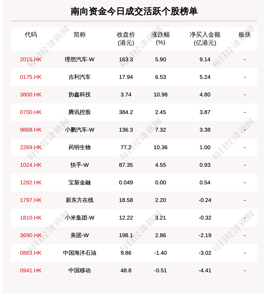 南向资金成交活跃个股榜单中,净买入个股共8只,金额最多的是理想汽车-W(2015.HK,收盘价:163.3港元),净买入9.141亿港元;净卖出个股共5只,金额最多的是中国移动(0941.HK,收盘价:48.8港元),净卖出4.413亿港元。