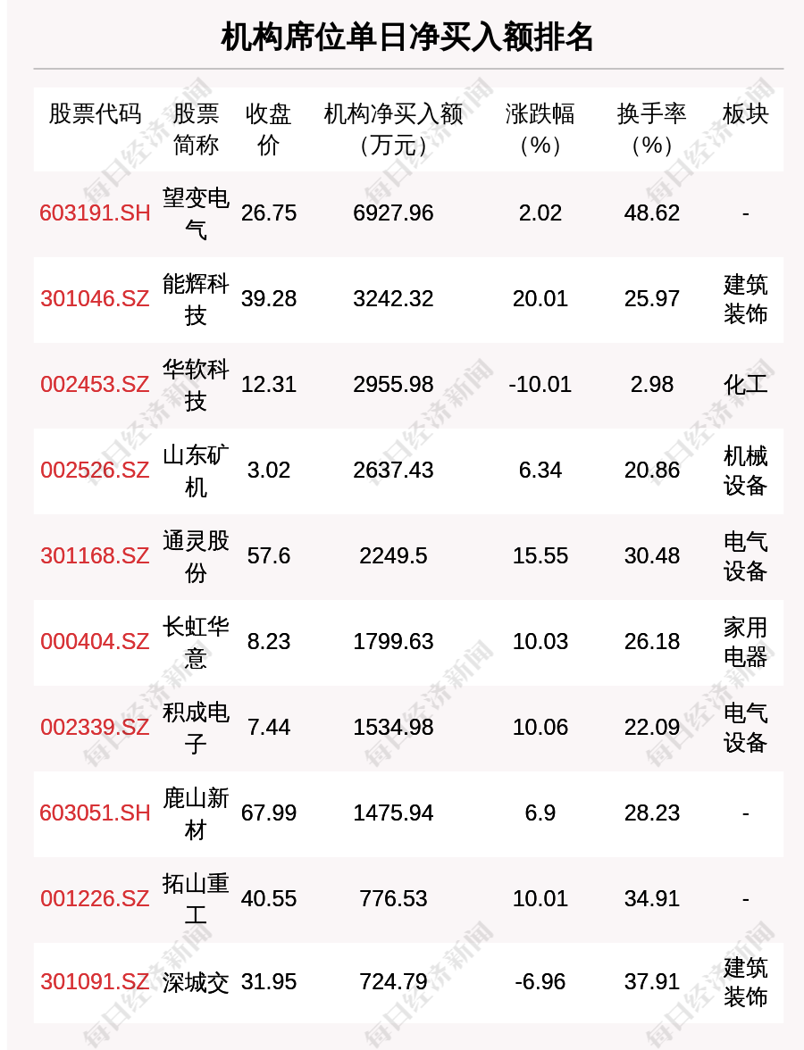 在龙虎榜中,涉及机构专用席位的个股有24只,净买入额前三的是望变电气、能辉科技、华软科技,分别为6927.96万元、3242.32万元、2955.98万元。