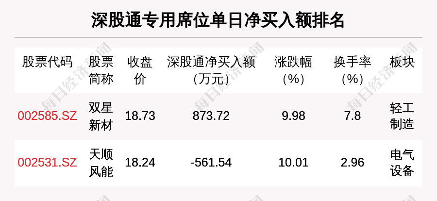 在龙虎榜中,涉及深股通专用席位的个股有2只,双星新材的深股通专用席位净买入额最大,净买入873.72万元。