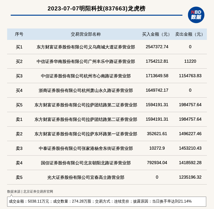 每经讯,2023年7月7日,北交所上市公司明阳科技(837663,收盘价:17.3元)登上龙虎榜,交易方式是连续竞价,披露原因是当日换手率达到21.14%,成交数量274.28万股,成交金额5038.11万元。买一席位为东方财富证券股份有限公司义乌商城大道证券营业部,买入254.74万元;卖一席位为东方财富证券股份有限公司拉萨团结路第二证券营业部,卖出198.48万元。