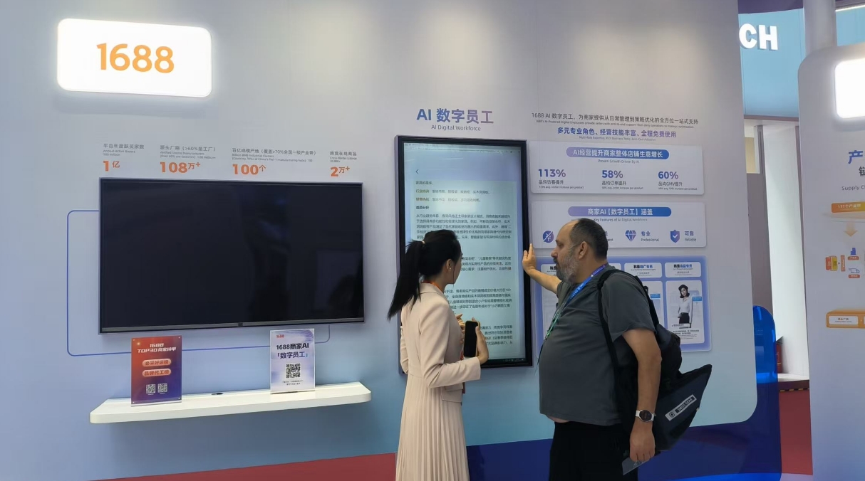 在阿里巴巴展区,记者注意到,每一个展区的主题设置都与AI相关。在1688 AI数字员工展台,工作人员正在为外国观众讲解。
