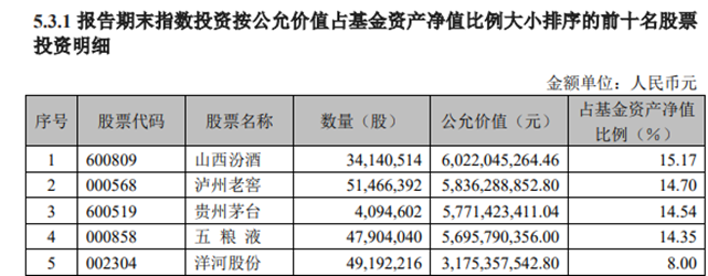 重仓股方面,截至6月30日,以公允价值来计算,招商中证白酒指数基金主要持股为山西汾酒、泸州老窖、贵州茅台以及五粮液,上述4只白酒股占该基金资产净值比例分别为15.17%、14.7%、14.54%以及14.35%。