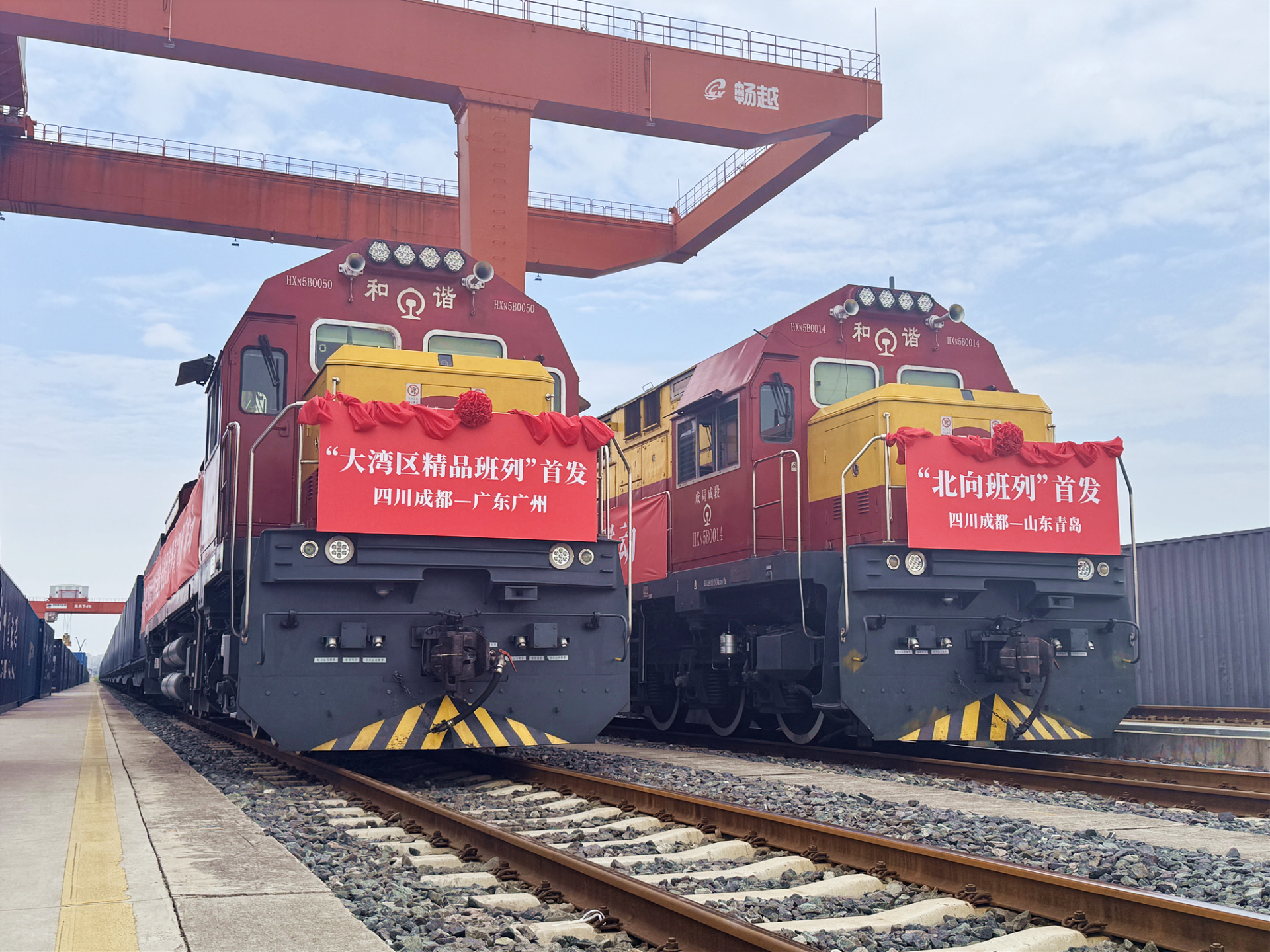 7月22日,从成都市青白江区的成都国际铁路港开往山东的“北向班列”、开往广州的“大湾区精品班列”以及两者的回程班列同时发车,标志着成都跨区域物流联动开启了新篇章,京津冀、长三角、粤港澳大湾区和成渝地区双城经济圈“四大增长极”实现了“铁轨上的闭环”。