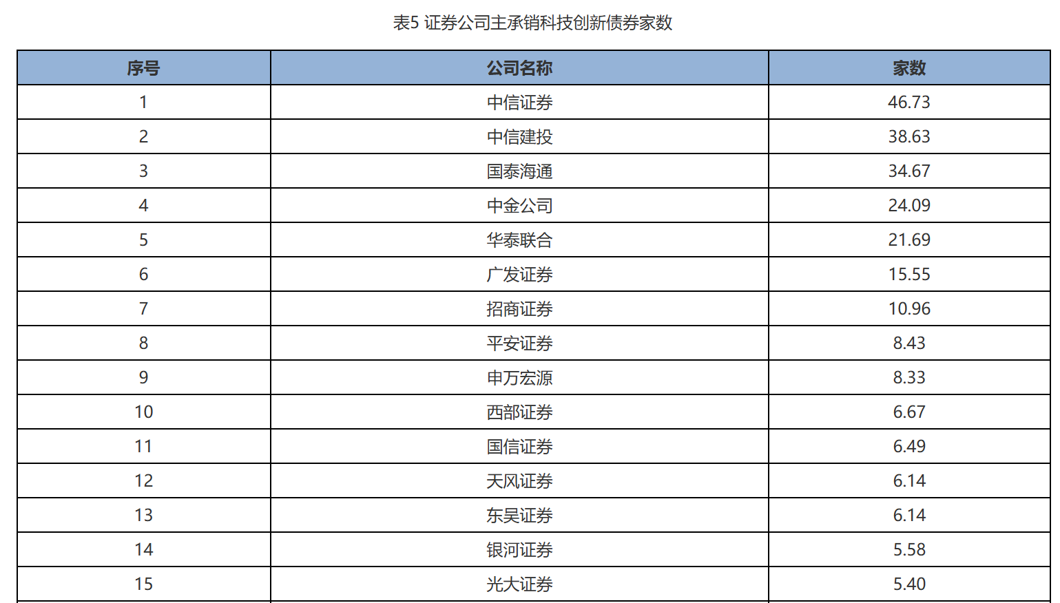 下表为证券公司主承销科技创新债券家数排名。中信证券、中信建投、国泰海通、中金公司、华泰联合分别以46.73家、38.63家、34.67家、24.09家和21.69家分列前五名。