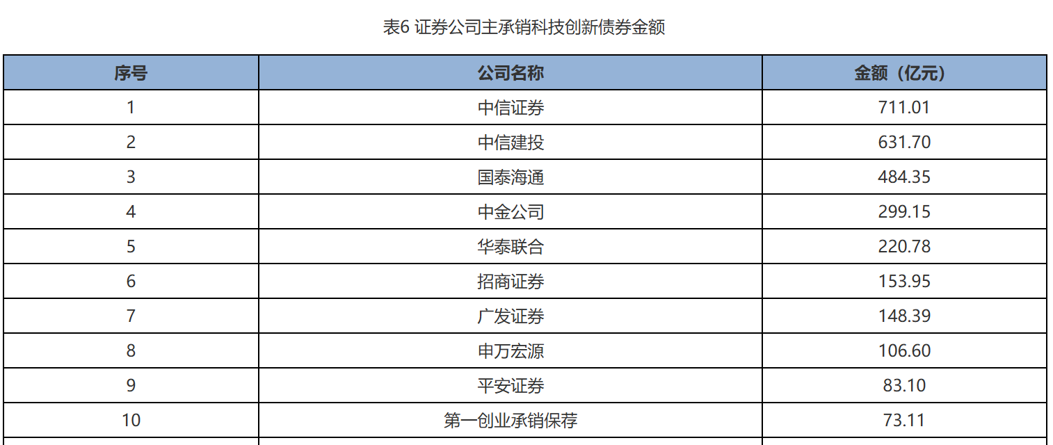 主承销科技创新债券金额方面,排名第一的中信证券主承销金额为711.01亿元。中信建投以 631.7亿元的主承销金额位列第二,与中信证券共同构成了第一梯队。国泰海通、中金公司分别以 484.35 亿元和 299.15 亿元的主承销金额排在第三和第四位。