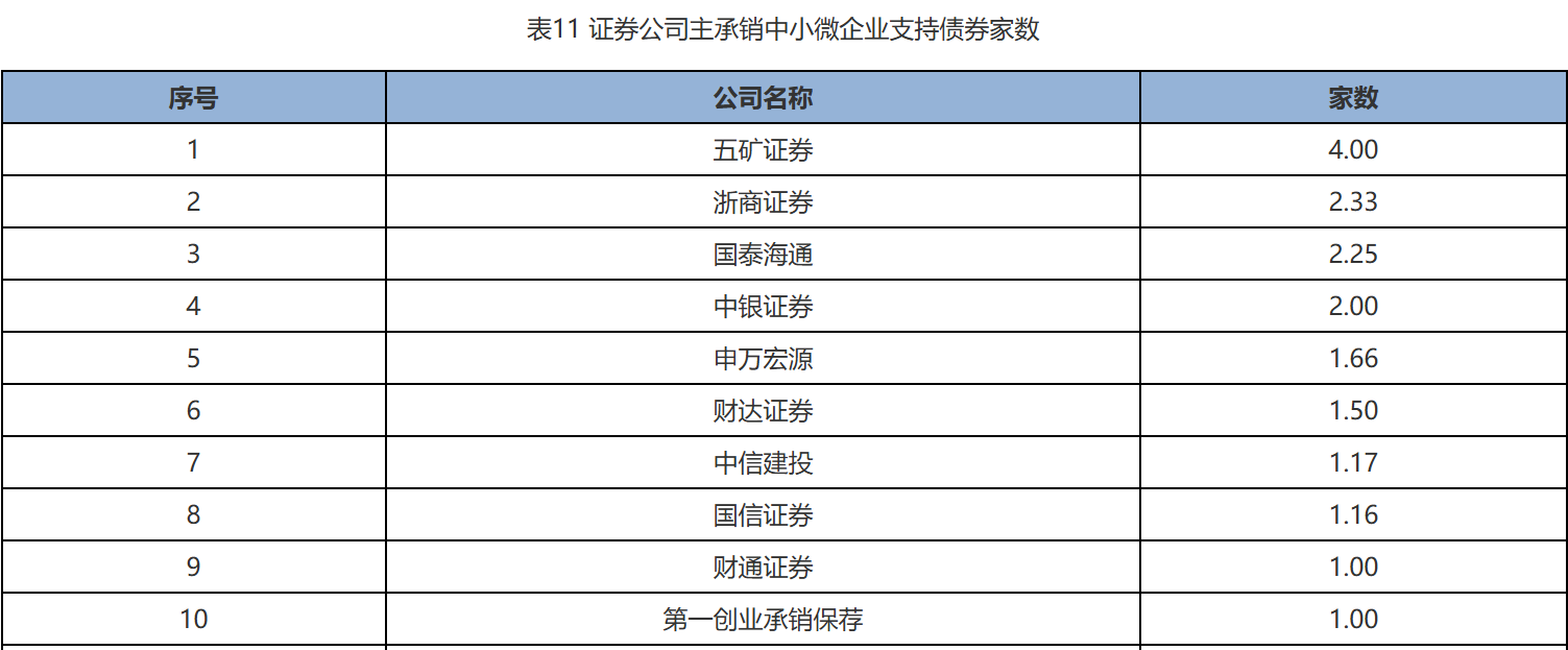 其中,五矿证券以4家的主承销家数位居榜首,在中小微企业支持债券承销业务方面表现十分突出。浙商证券和国泰海通分别以2.33家和2.25家的主承销家数位列第二和第三。