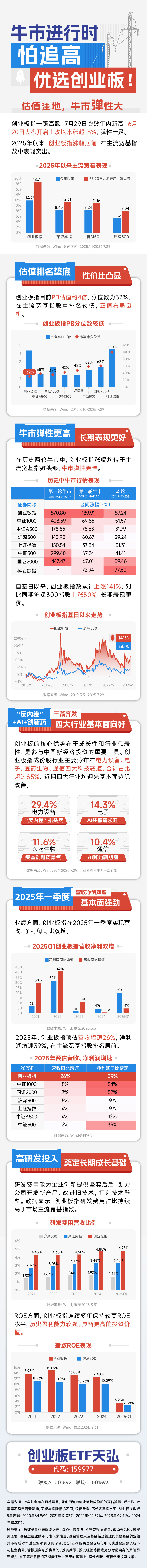 业绩方面,创业板指在2025年一季度实现营收、净利润同比双增。2025年,创业板指预估营收增速26%,净利润增速39%,在主流宽基指数中排名居前。