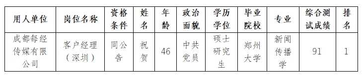 根据我司前期发布的招聘公告及招聘相关规定,经资格审核、面试、复试、背景调查、体检等程序,拟聘祝贺为客户经理(深圳),现将名单予以公示。