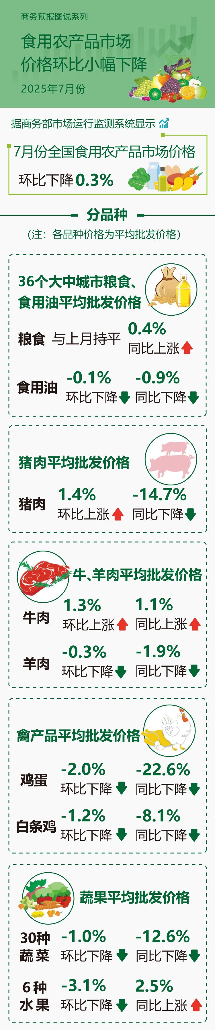 7月份,全国食用农产品市场价格环比下降0.3%。从主要品种来看,36个大中城市粮食平均批发价格与上月持平,同比上涨0.4%。食用油平均批发价格环比下降0.1%,同比下降0.9%。猪肉平均批发价格环比上涨1.4%,同比下降14.7%。牛肉平均批发价格环比上涨1.3%,同比上涨1.1%。羊肉平均批发价格环比下降0.3%,同比下降1.9%。鸡蛋、白条鸡平均批发价格环比分别下降2.0%和1.2%,同比分别下降22.6%和8.1%。30种蔬菜平均批发价格环比下降1.0%,同比下降12.6%。6种水果平均批发价格环比下降3.1%,同比上涨2.5%。