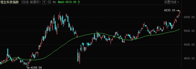 今日(9月17日)恒生科技指数高开高走,上涨超过2%,最高达到6233点,该点位创出了近四年的新高。
