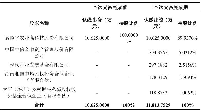 根据公告,中信金融资产、现代种业发展基金有限公司、湖南湘鑫中垦股权投资合伙企业(有限合伙)、太平(深圳)乡村振兴私募股权投资基金合伙企业(有限合伙)作为战略投资者,4家机构将分别以4亿元、2亿元、1.2亿元、8000万元的价格进行认购,对应取得联创种业增资后5.0312%、2.5156%、1.5094%、1.0062%股份,因此,增资后隆平高科对联创种业的持股比例将由100%变更为89.94%。