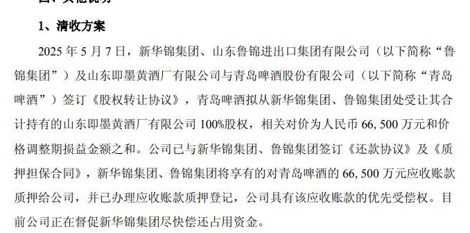 今年5月,青岛啤酒一纸6.65亿元的收购公告,带火了即墨黄酒这家地方黄酒厂。不过,6.65亿元“卖身钱”还没到手,这笔应收账款此前已被大股东质押给了上市公司ST新华锦。