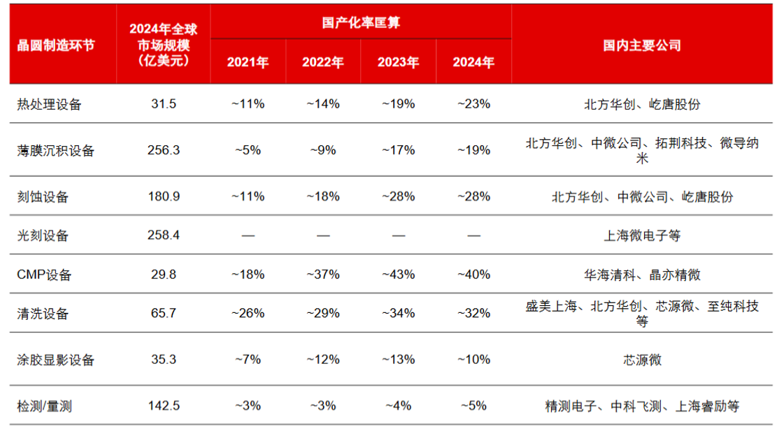 国产替代在近年来高速发展,2024年CMP、清洗等环节国产替代率已达到30%以上,此外刻蚀、热处理也已超过20%,但目前量检测、光刻环节国产环节还在个位数或接近0。总体上看,国产替代空间广大。