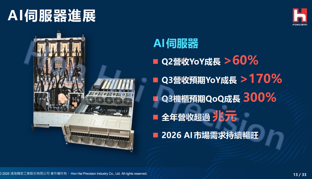 鸿海精密是AI服务器的主要代工厂之一,据其预期,AI伺服器收入Q3或同比增长170%,环比或成长300%。