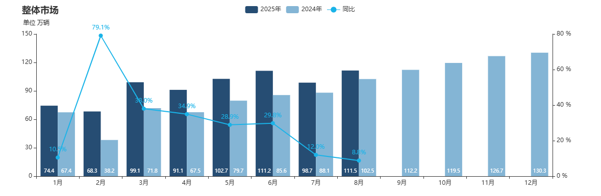 据乘联会数据,7、8月份中国新能源汽车销量98.7万台、111.5万台,分别yoy+12.0%。+8.8%。预计Q3销量同比增速维持10%左右。