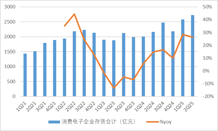 从存货水位看,2025Q2消费电子上市企业合计为2729.67亿元,yoy+26%。存货增速自2023Q2见底后回升,今年以来在国补、AI等因素刺激之下,消费电子补库动作明显,存货水位或维持在较高位置运行,2025Q2存货水平是近年新高,预期Q3景气度良好。