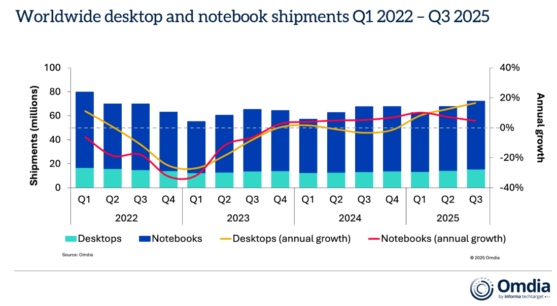 据omdia,2025 年第三季度台式机、笔记本电脑和工作站的总出货量增长6.8%,达到7200万台。其中,笔记本电脑(包括移动工作站)出货量增长4%至5720万台,而台式机(包括台式工作站)出货量增长17%至1520万台。距离Windows 10终止支持截止日期还有不到一周的时间,所有最终用户群的更新需求仍然是推动发货和激活增长的主要因素。