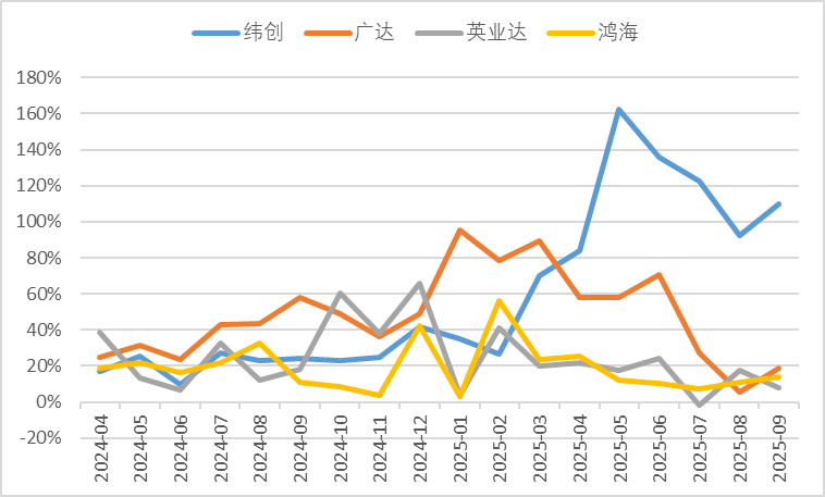 从主要的台股代工厂商月度营收增速看,在去年同期较高基数背景下,Q3同比增速持续保持在高位,其中9月份出现了明显的提高,可能除了AI相关产品出货量有所增长之外,也受到消费电子需求刺激。