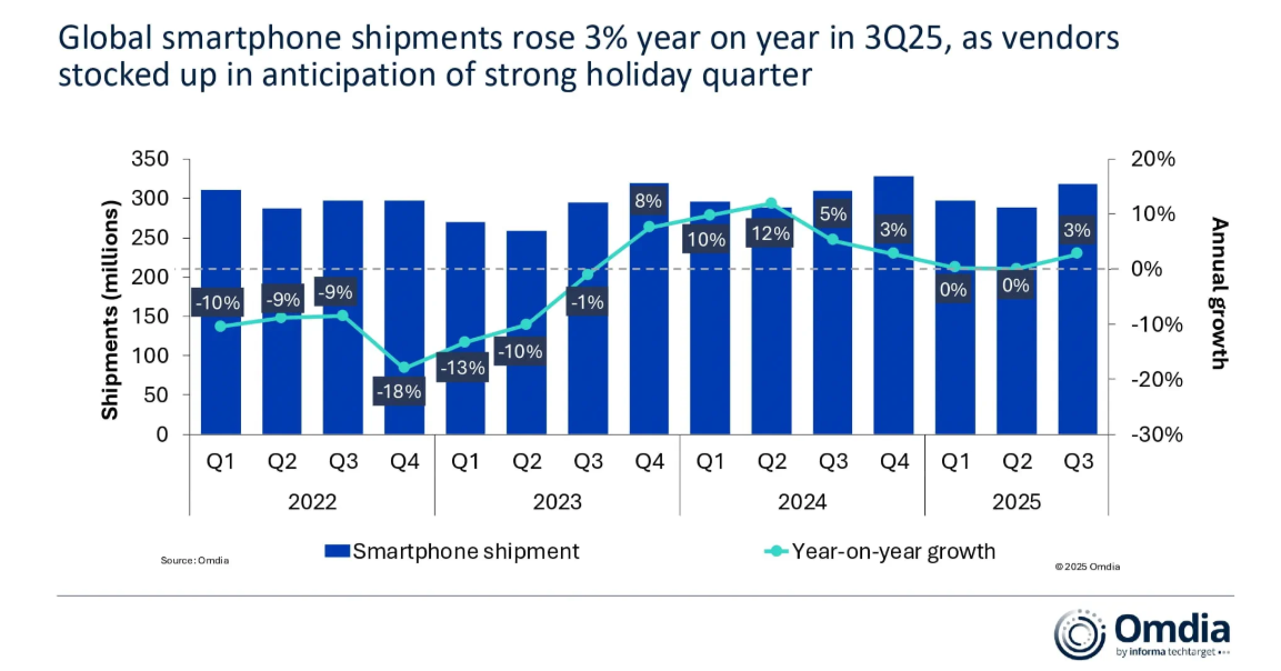 全球智能手机销量——2025Q3预计yoy+3%
