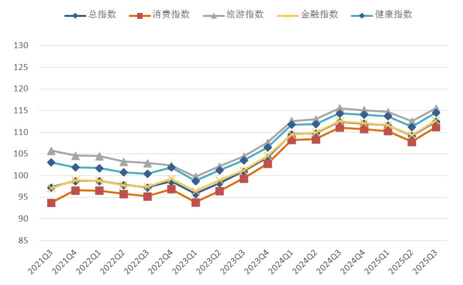2025年第三季度海西地区金融、旅游、消费、健康信心总指数为112.49点,环比(较2025年第二季度,下同)上升3.30点,同比(较2024年第三季度,下同)上升0.08点。其中消费指数111.20点,环比上升3.39点,同比上升0.09点;旅游指数115.50点,环比上升2.97点,同比下降0.05点;金融指数112.65点,环比上升3.30点,同比上升0.10点;健康指数114.50点,环比上升3.22点,同比上升0.13点。