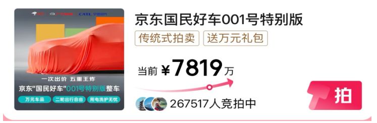10月22日18时,京东“国民好车”001号在京东拍卖平台结束竞拍,竞拍价定格在7819万元。此次竞拍从10月22日14时正式开拍,最终超26万人参与了竞拍。