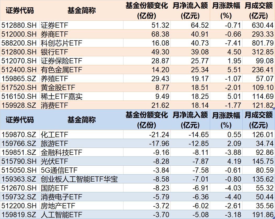 行业主题上看,证券、科创芯片等相关ETF被资金看好,而化工、旅游相关ETF被资金抛售。