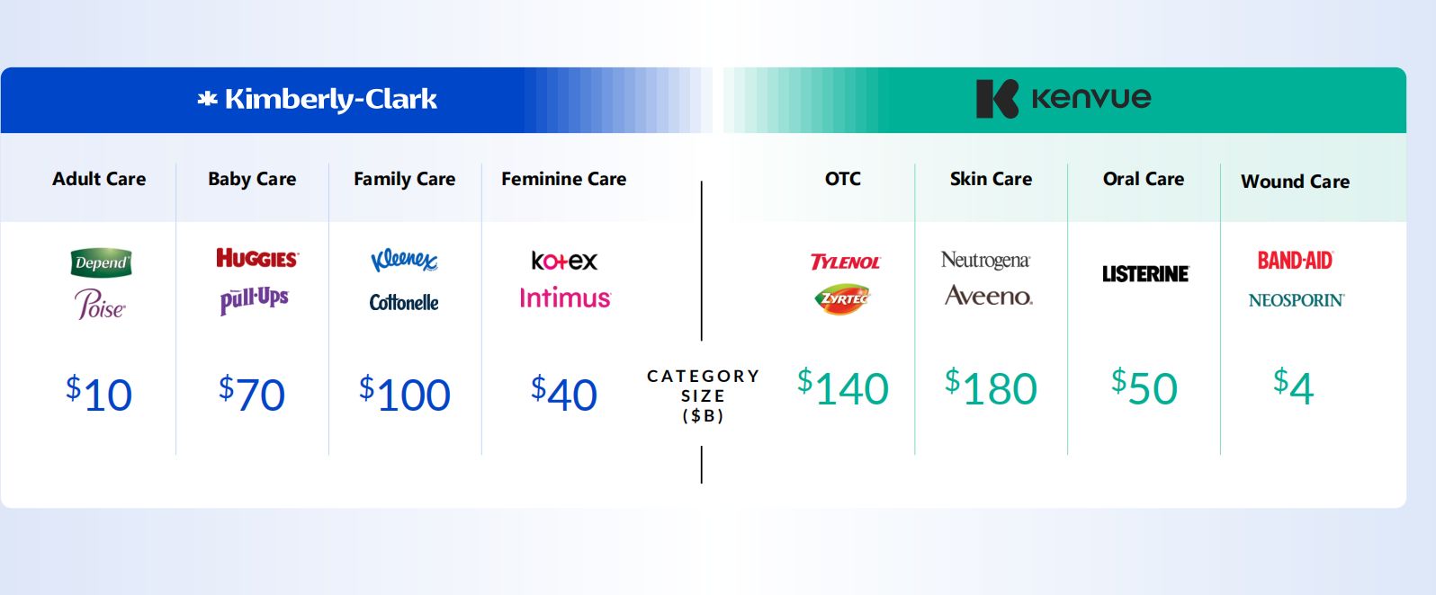 对于中国消费者而言,金佰利和科赴或许并不熟悉,但两家公司旗下的产品早已渗透进日常生活。公开资料显示,金佰利在中国市场的业务起始于1994年,好奇纸尿裤、高洁丝卫生巾等都为中国消费者所熟知;科赴的前身是强生的消费者健康部门,两年前正式脱离强生成为一家独立的上市企业,旗下城野医生、强生婴儿、大宝、邦迪等品牌在中国知名度较高。