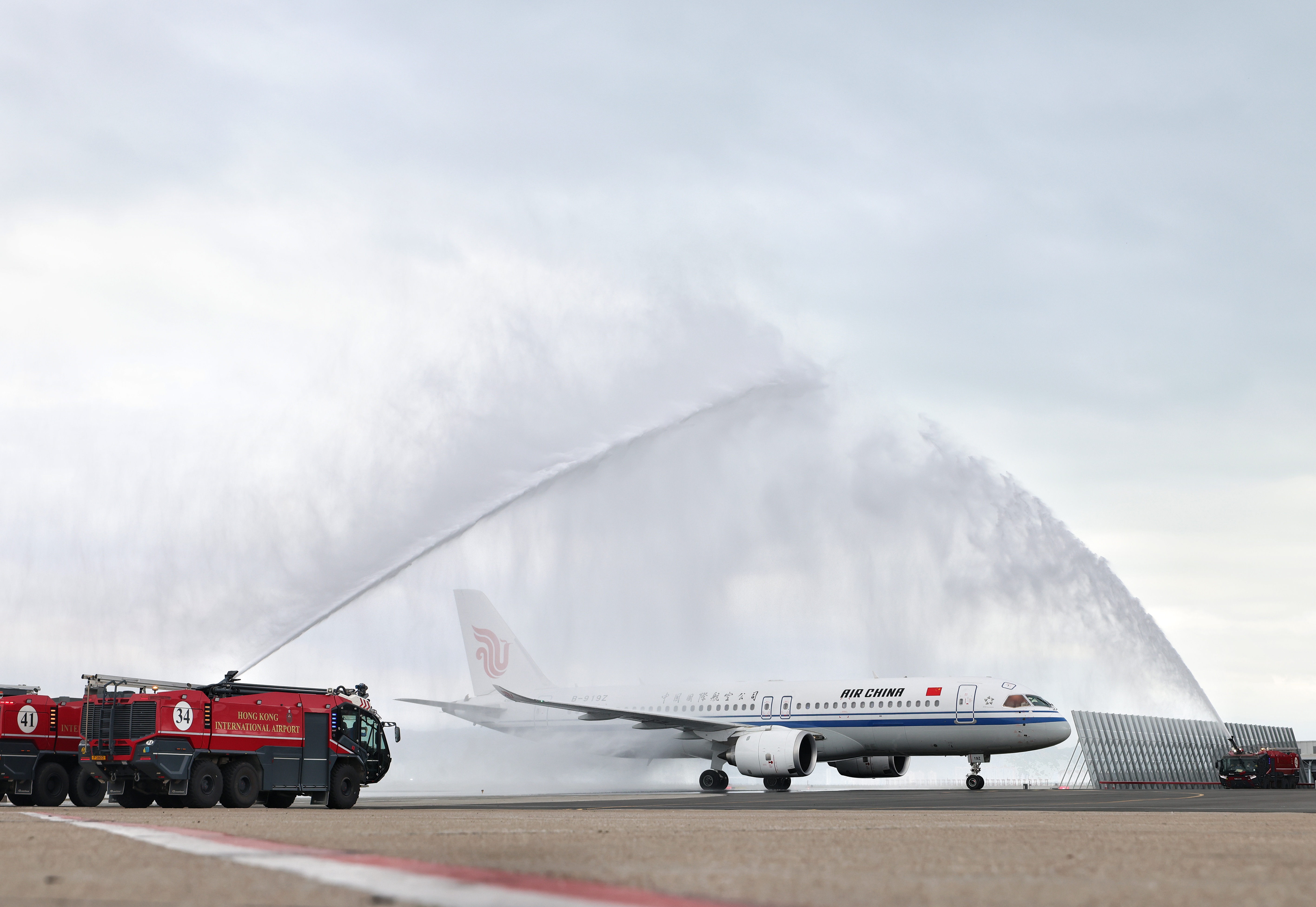 2025年11月7日上午11时36分,中国国际航空股份有限公司(以下简称“国航”)CA101航班平稳降落在香港国际机场,国产大飞机C919首次身披五星红旗执行北京至香港航线,飞机缓缓穿过水门,接受民航界最高礼遇。当天下午,中国民用航空局、香港中联办、香港特区政府相关机构、爱国组织、“两航”联谊会、中航集团、在港中资企业及媒体代表等各界嘉宾120余人汇聚一堂,共庆C919载旗执飞香港航线圆满成功,并举办“国航C919重飞‘两航起义’北飞光辉航程”系列主题活动启动仪式,嘉宾代表共同按下启动装置,宣布活动拉开帷幕。