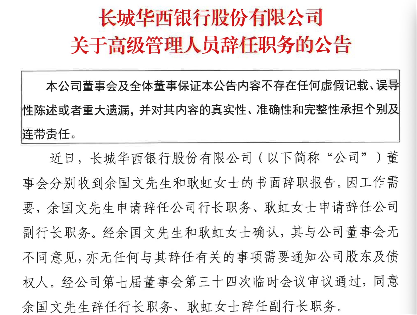 长城华西银行近日宣布,董事会收到余国文、耿虹的书面辞职报告,两人均因“工作需要”辞去职务。