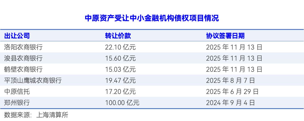 近日,中原资产管理有限公司(以下简称中原资产)发布公告称,公司于2025年11月13日与洛阳农商银行、浚县农商银行、鹤壁农商银行签署《不良资产转让协议》,三家银行分别向中原资产转让不良资产,转让价款分别为22.10亿元、15.6亿元、15.03亿元,合同已生效。